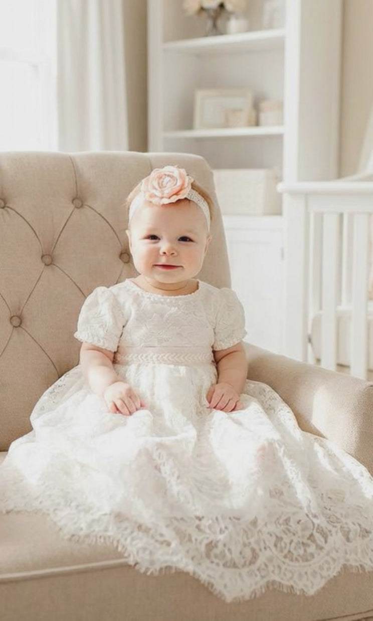 The Eve Gown is a timeless white lace christening gown designed to celebrate life’s most meaningful moments with elegance and grace. Crafted in classic white, this infant baptism dress features intricate lace layered over a soft, breathable lining to ensure gentle comfort throughout the day. Delicate lace detailing on the bodice and skirt creates a refined, heirloom-inspired silhouette, while a soft blush ribbon at the waistband adds a subtle feminine touch. Finished with an adjustable back tie bow for the perfect fit and a matching lace bonnet, the Eve Gown is ideal for baptisms, christenings, blessings, and first milestone photos, offering a beautifully photographed keepsake to treasure for years to come.